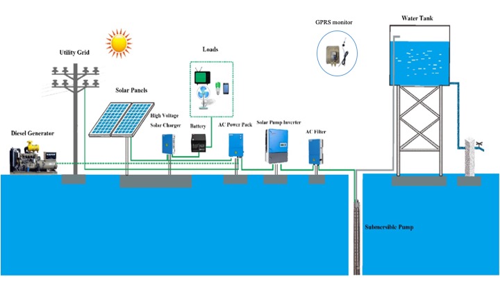 Nuestros sistemas de bombeo solar constan de paneles solares, inversor de bomba solar, bomba de CA y dispositivo de almacenamiento de agua.